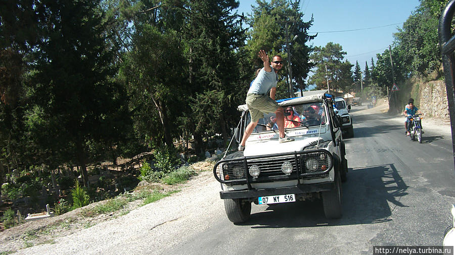 Итак семь джипов тронулись в путь из Махмутлара, десять минут до Алании и начинается подъём в горы. В населённых пунктах в горах все подверглись пару раз обливанию из шлангов, по-видимому это тоже входит в программу.