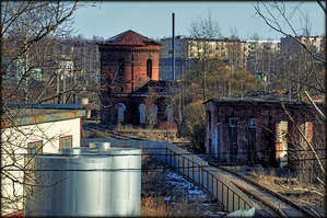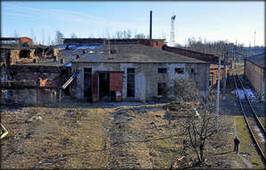 Напротив вокзала, за заброшенным сталинским депо, находится массивное здание круглого паровозного депо, которое тоже является ровесником железнодорожного вокзала, чуть дальше здание водонапорной башни.