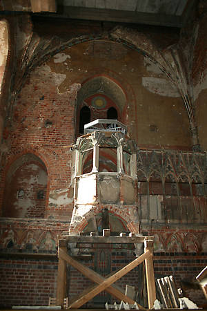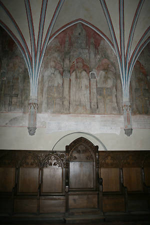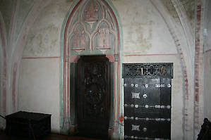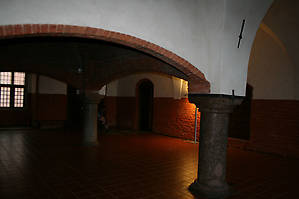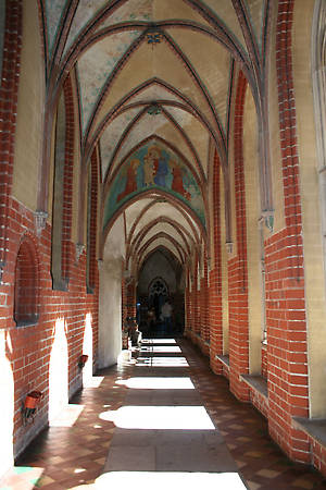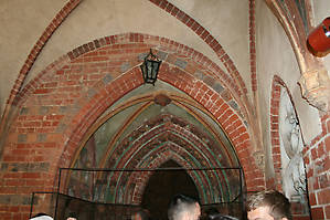 Стоит обратить внимание на дошедшие до наших дней, "Золотые ворота" XIII века — входной портал в Костел.А теперь войдем в Капитулярий — мозг и сердце Мальборка! Здесь принимались и провозглашались важные решения, затрагивающие интересы замка и всего ордена. Здесь раскаивались, отпускали грехи и наказывали рыцарей, нарушивших суровый устав ордена. Хочу привести примеры некоторых "забавных" провинностей. Так, если не помыл руки перед едой или после посещения туалета и сам сознался в содеянном, то полагалось 10 ударов уже не помню чем:)), розгами, возможно. Если на тебя донесли твои товарищи — уже 20 ударов! Еще нельзя было после еды вытирать жирные руки и рот о бороду соседа! За это тоже наказывали.