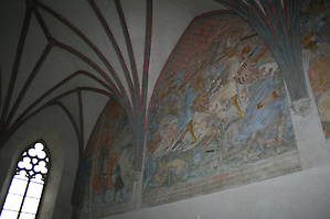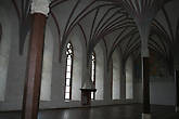 На этом мы заканчиваем осмотр Среднего замка и переходим в Высокий, который, как я уже говорила, предназначался только для рыцарей-монахов. Рассчитанный более, чем на 60 человек проживающих. Спальни располагались на первом этаже. Там же находился Костел Пресвятой Девы Марии, Капитулярий (Зал заседаний), кладовые и покои кладовщика. Выше располагался Рефектарий