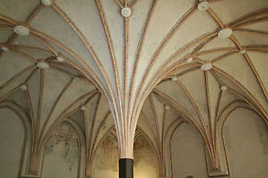 Далее перейдем в самое роскошное помещение Дворца — Летний Рефектарий (Летняя Трапезная), где принимали почетных гостей в летнее время. Он, безусловно, жемчужина готической архитектуры. Его мощный веероподобный свод подпирает единственная тонкая гранитная колонна и 16 стенных консолей. Благодаря такому архитектурному решению, стало возможным заменить стены окнами, которые в то время были из цветного стекла. Во время осады замка, пушечное ядро всего лишь два пальца не долетело до колонны, что повлекло бы за собой полное разрушение этого уникального зала.