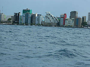 Далее мы приземлились, прошли паспортный контроль и сели на катер до острова, проезжая мимо столицы — Мале.