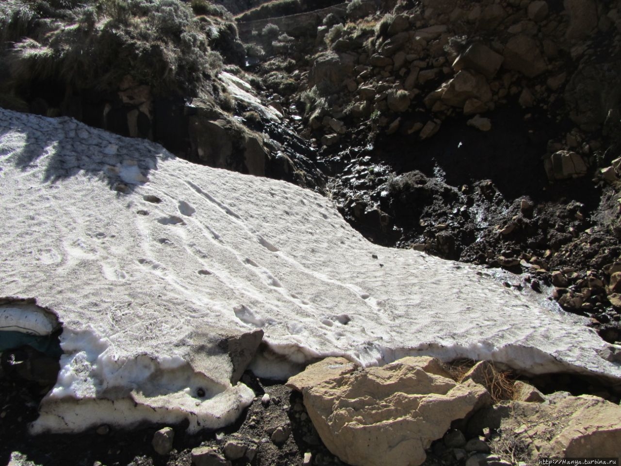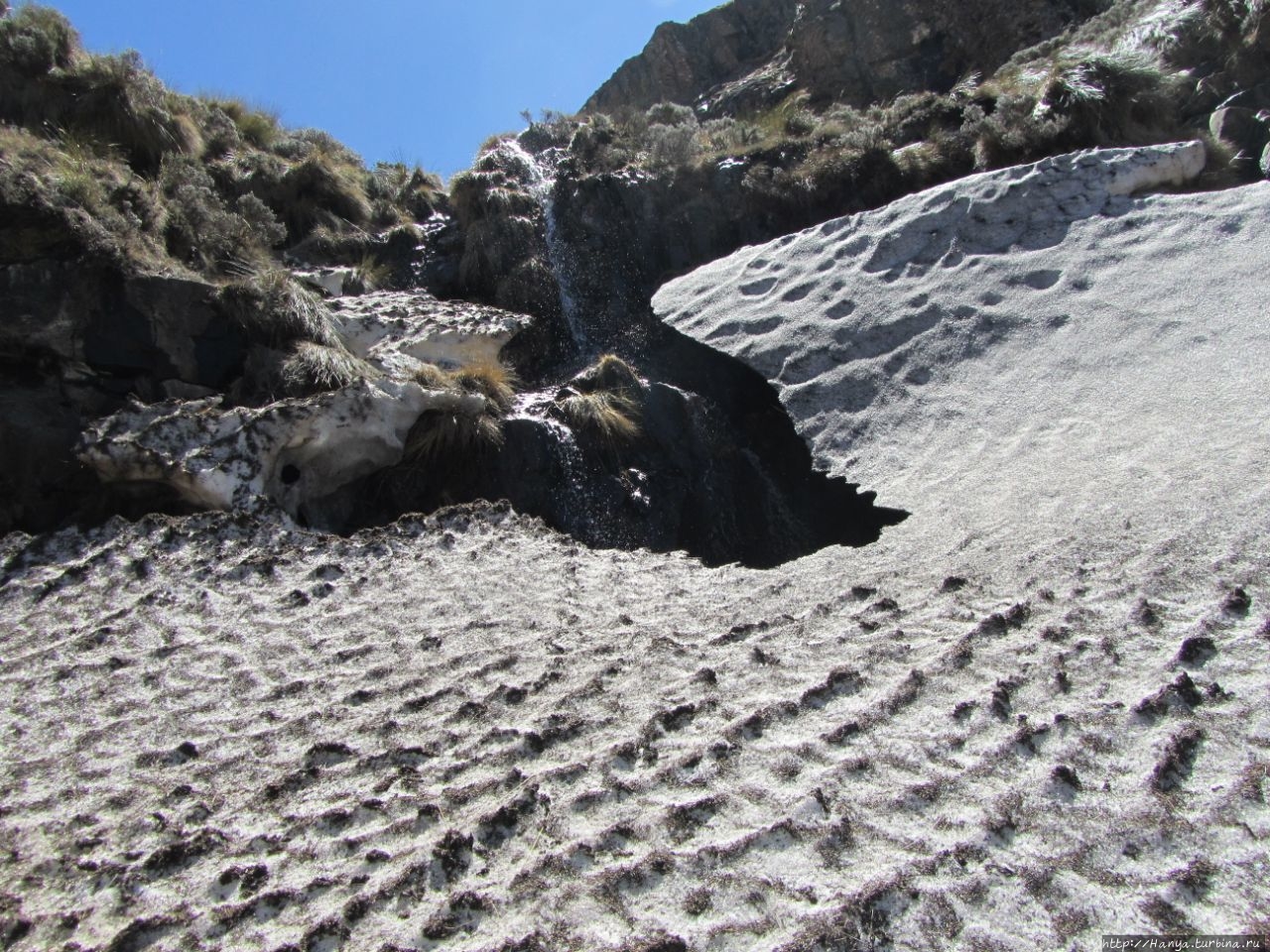 А водитель комментирует, что снег на расселинах в целях безопасности укрепляют мешками, и обращает наше внимание на их торчащие углы.