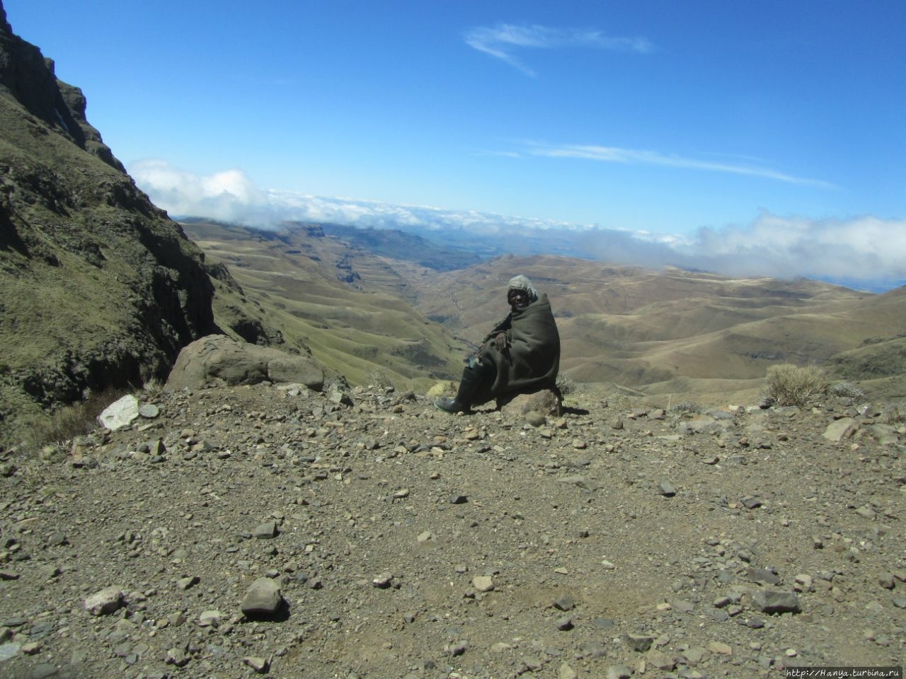 Неожиданно на одном из утесов, рядом с дорогой видим темного человека в резиновых сапогах и закутанного в одеяло. Посыпались предположения, кто он – от пастуха, до пограничника, охраняющего доступ в Лесото.