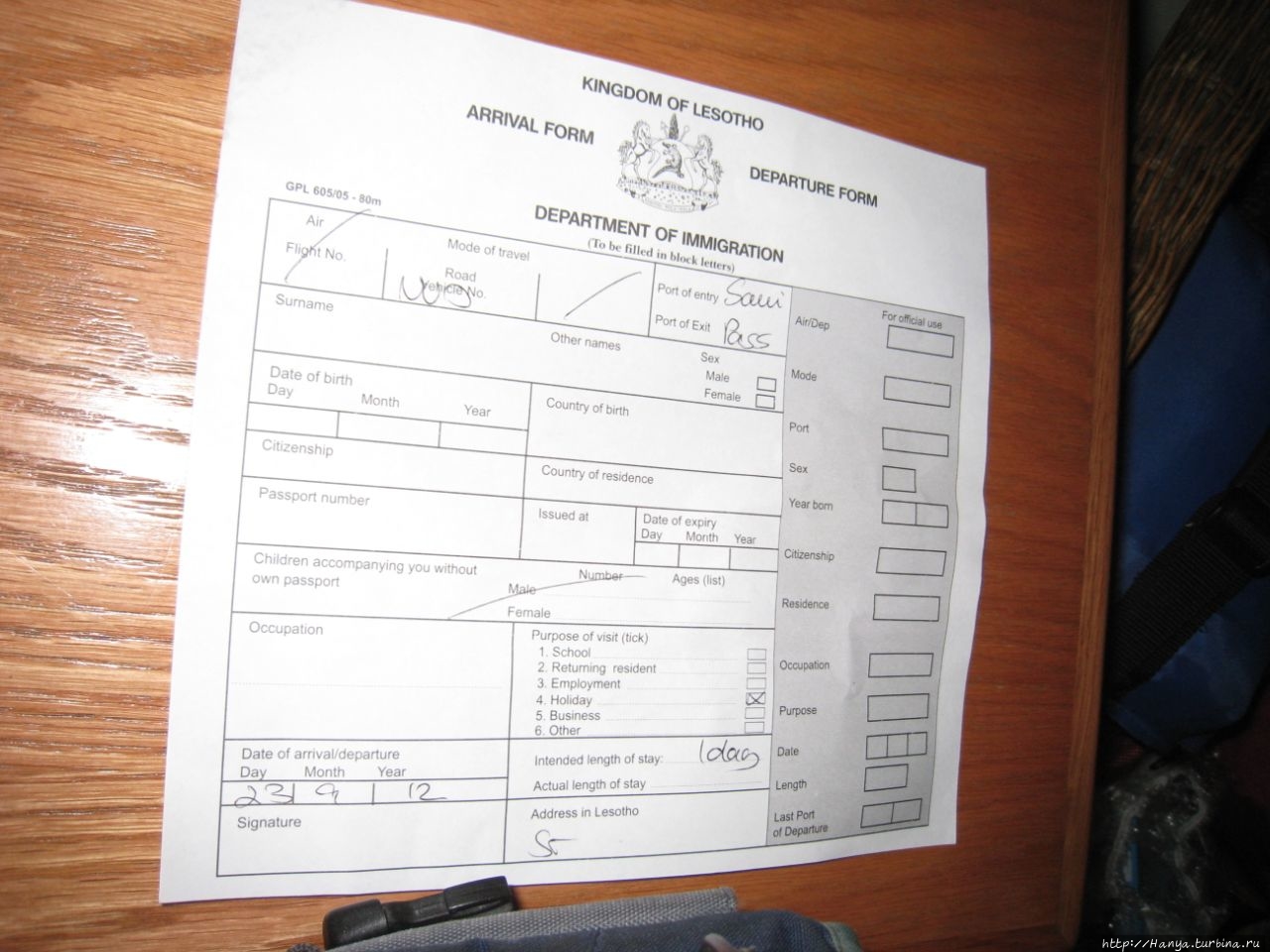 Вчера вечером мы заполнили иммиграционную карточку для посещения Лесото, мы уверены, что виза нам не нужна: эту информацию мы вычитали в и-нете дома, ее также подтвердила турфирма. Однако не все так просто в королевстве, и Сибони сообщает нам «пренеприятнейшее известие»: у наших австралийцев виза есть и она оформлена дома заранее, только у нас четверых могут возникнуть проблемы. Он говорит, что нам, возможно, придется заплатить по 150 рэнд с человека на границе с Лесото. Правда, при этом оговорился, что все будет зависеть от бригады. Мы предупреждены, а значит, вооружены.