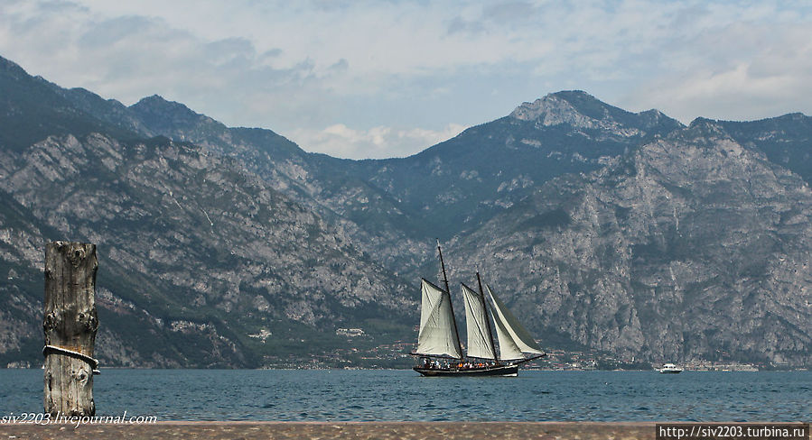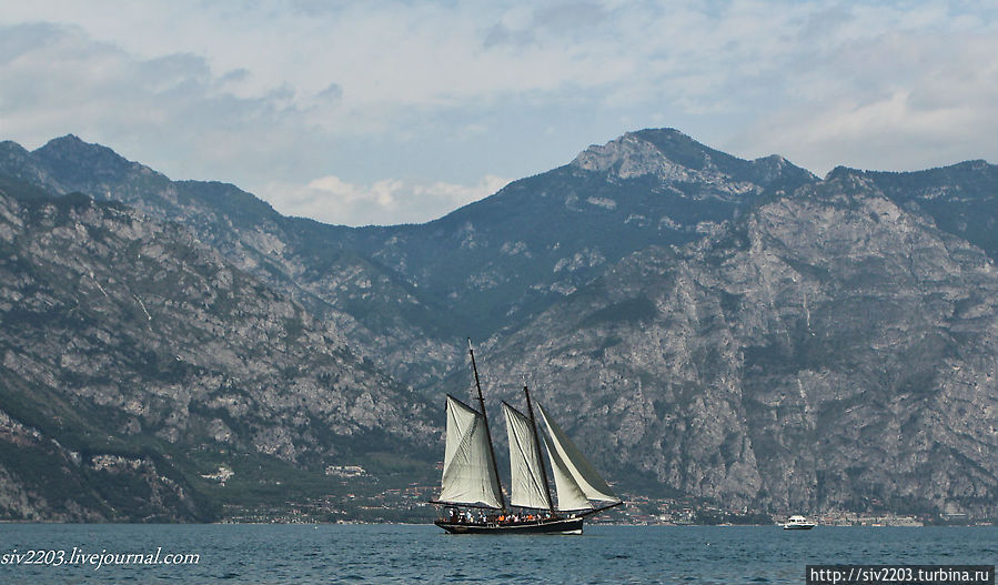 Еще в Одессе запланировала хоть глазком увидеть озеро Гарда — огромное, в предгорьях Альп. У нас все получилось. Мы поехали на целый день в сторону озера, но одним озером не обошлось. Прийдется поделить на несколько постов. Сначала мы приехали в малюсенький городок Мальчезине, который стоит в северной части приозерного края. Очень симпатичное местечко. Там мы планировали сесть в фуникулер, который поднимет нас на гору Монте Бальдо. А пока ждали, когда освободится место для машины на паркинге, пошли гулять по городку в сторону озера. Толик остался, потом потерялся, а мы пошли гулять по малюсенькому городку.