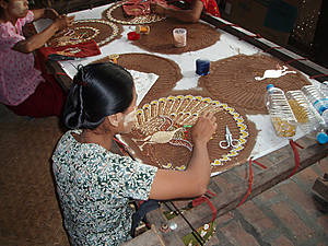 В соседних комнатах женщины делают сувениры из золотой фольги и покрывают сувениры