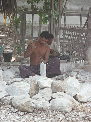 Каменотесы из мрамора вытачивают фигуры Будд разных размеров, а также различные