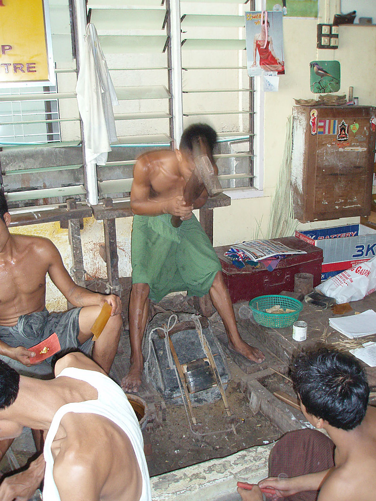 В золотой мастерской, мужчины вручную разбивают кувалдой кусочки золота,делая из них
