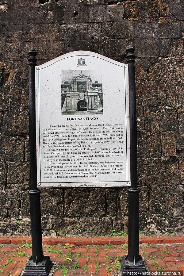 Форт Сантьяго в былые времена играл роль испанского порта, который позже был разрушен. В период Второй Мировой войны форт превратили в тюрьму, где японцами не раз совершались массовые казни людей. Сегодня форт представляет собой красивейший парк, на территории которого можно увидеть коллекцию автомобилей, в разные времена перевозивших филиппинских президентов, или посетить Музей Ризаль Шрайн, который собрал изготовленные Хосе Ризалем предметы — в том числе его прощальную поэму, написанную накануне казни.