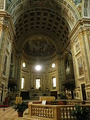 литературного фестиваля ежегодно проходящего в Мантуе. Проскользнув между слушателями я вошёл в храм и первое, что я увидел, были огромные леса занимавшие весь центральный неф базилики. Во время землетрясения в мае 2012 года храму были нанесены повреждения, возникла вероятность обрушения купола базилики.