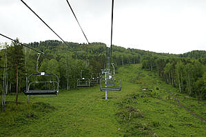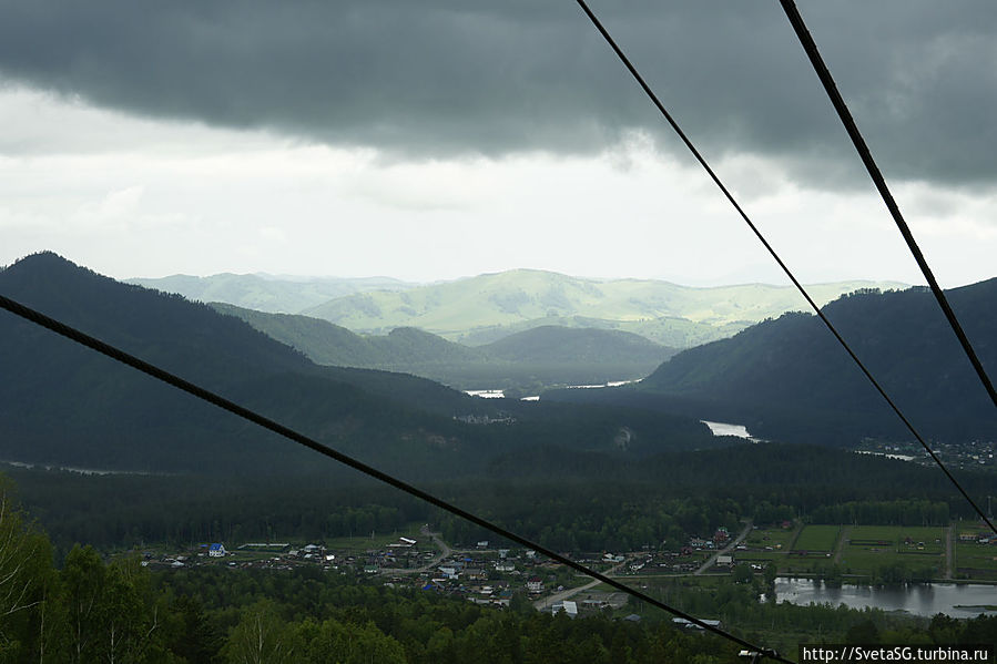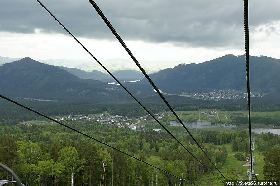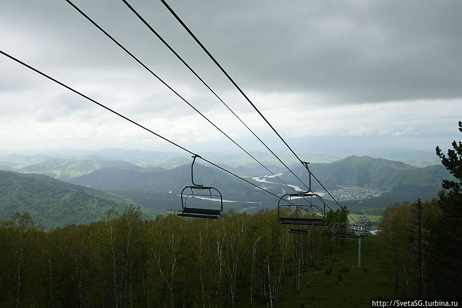 Славный город Манжерок, воспетый Эдитой Пьехой в одноименной песне, находится недалеко от Горно-Алтайска. Кругом турбазы, гостиницы и т.п. Цивилизация в общем, ничего примечательного. Но не так давно там начали развивать горнолыжный курорт и открыли канатно-кресельную дорогу. Такой аттракцион я пропустить не могла. Поэтому мы свернули с дороги и, следуя указателям, подъехали к канатке. Летом она тоже работает, экскурсионный билет туда-обратно стоит 300 руб. Из местных никто желания не изъявил — поехала я одна.