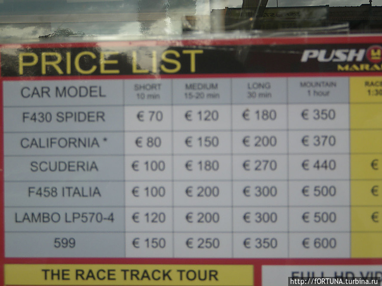 Выбрали по прайсу нужный отрезок времени (от 5 мин ),тип машины Ферари калифорния( в ней может поместиться еще один пассажир),заплатили,заполнили бумаги. Мужа с сыном отвезли на полигон ,к выбранной машине.Рядом с мужем сидел сотрудник фирмы,видимо караулил .что бы ее не угнали,сын на заднем сиденье.От этого "удовольствия" я отказалась.