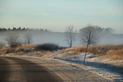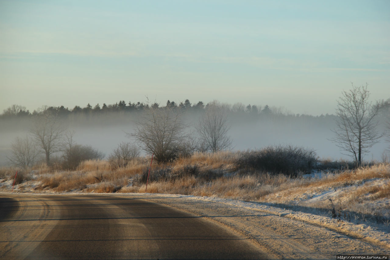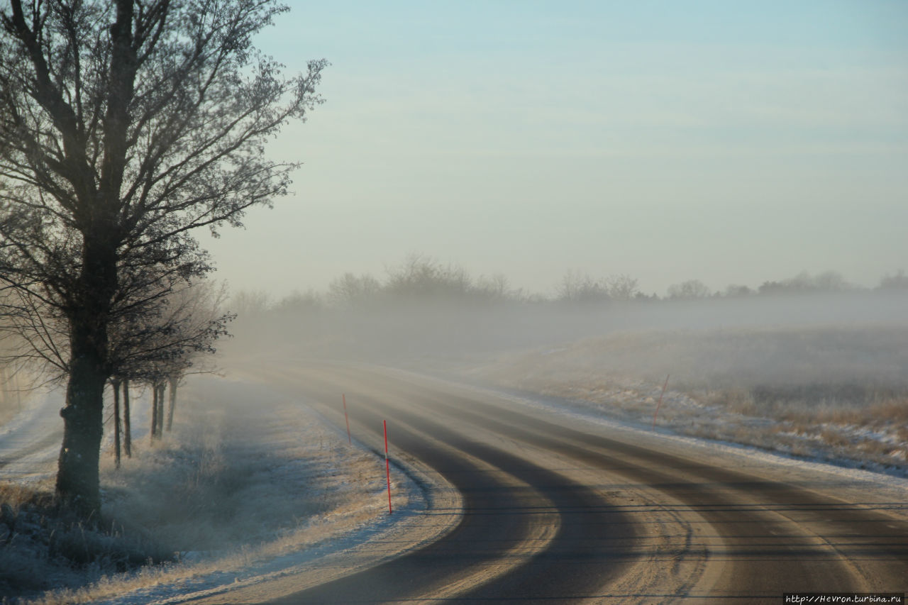 Выехав из замка, мы очутились в объятиях зимнего тумана, причем очень густого. Что было даже странно, мне всегда казалось, что туман бывает лишь по утрам, но никак не в обед. Да и когда мы ехали в замок, его не было. Но выглядело это очень красиво и загадочно.