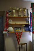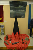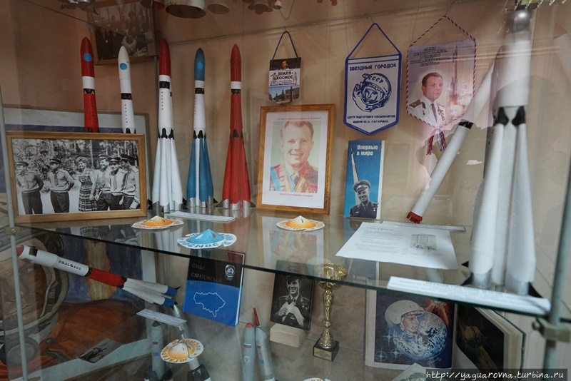 Масса предметов на небольшом стенде связана с космонавтикой.