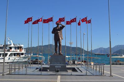 В Мармарисе часто можно услышать "в 100 метрах от Ататюрка", "пройдите по набережной, а возле Ататюрка сверните налево". При этом говорящие и слушающие прекрасно понимают, что речь идёт о памятнике Ататюрку, установленному на набережной.Позади него находится набережная, а вдали за спиной — Райский остров.