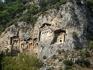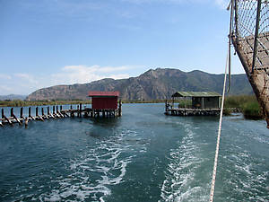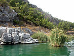 По дороге видим на берегу реки ликийские гробницы, вырубленные в скале. Видим рыбные ворота. Экскурсовод объясняет, что так ловят рыбу, которая возвращается с нереста из моря по реке Дальян. Ворота автоматические, а раньше, совсем недавно, были другие, ручные. Она и их показывает. Там артель рыбная работает.