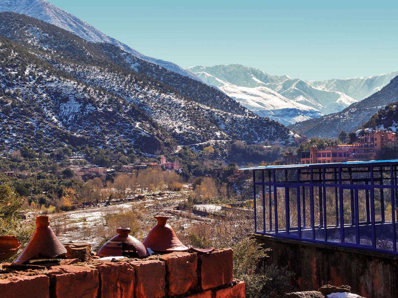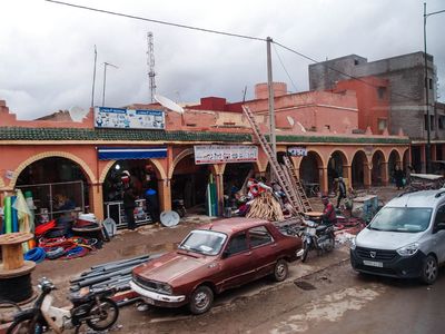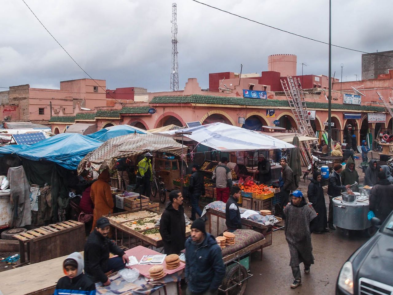 Рынки в большинстве сёл однотипные, но слеплены в мавританском стиле — арочные галереи. Ближе к Марракешу эти строения красного цвета, отъезжаешь чуть дальше, и появляется типичное для многих городов Марокко сочетание белого с голубым.