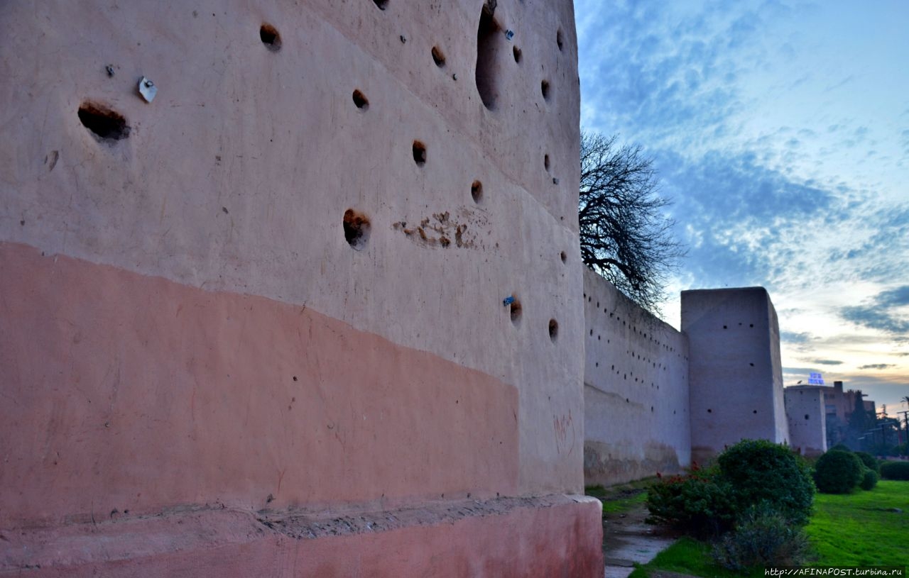 Ещё пару слов хочется сказать о дворце Эль-Бади. Наш отель был расположен у высоченной каменной стены окружающей эту знаменитую достопримечательность в Марракеше. Стена древняя, свежеокрашенная, местами с облупившимся фундаментом, но самое интересное, что на ней и её башнях гнездятся аисты – целый птичий городок!