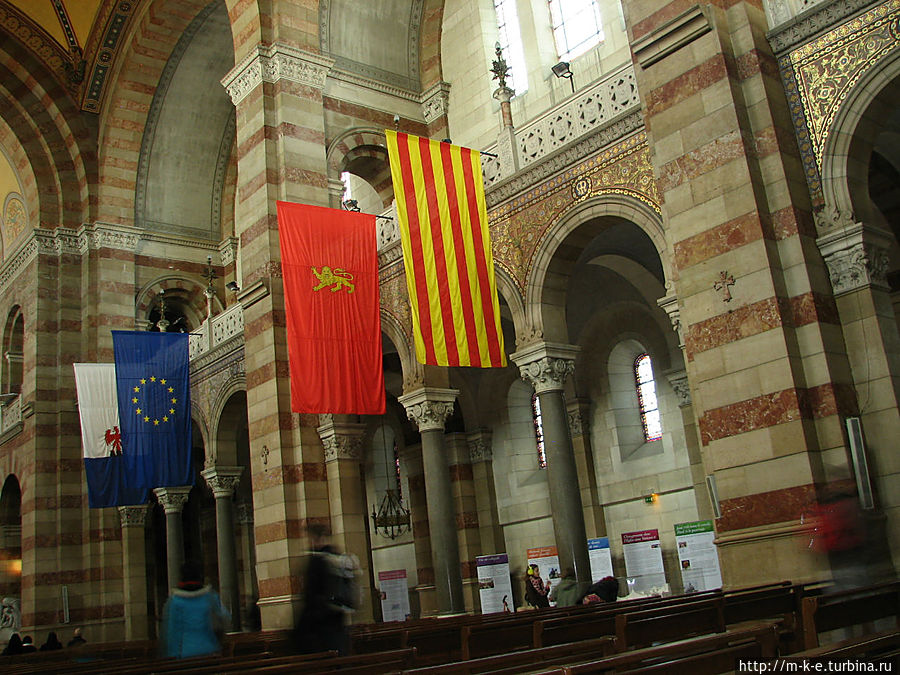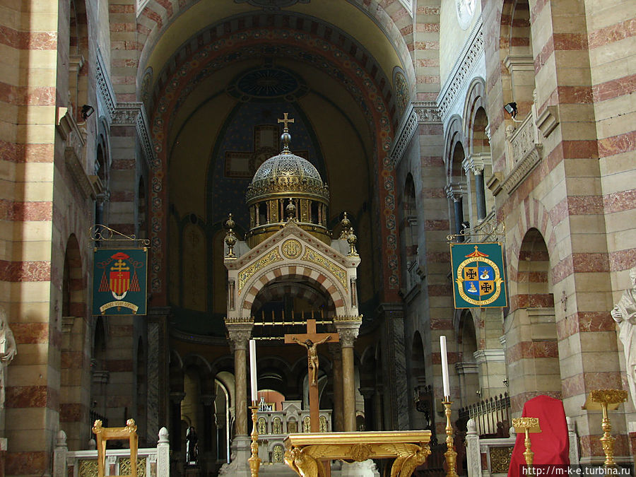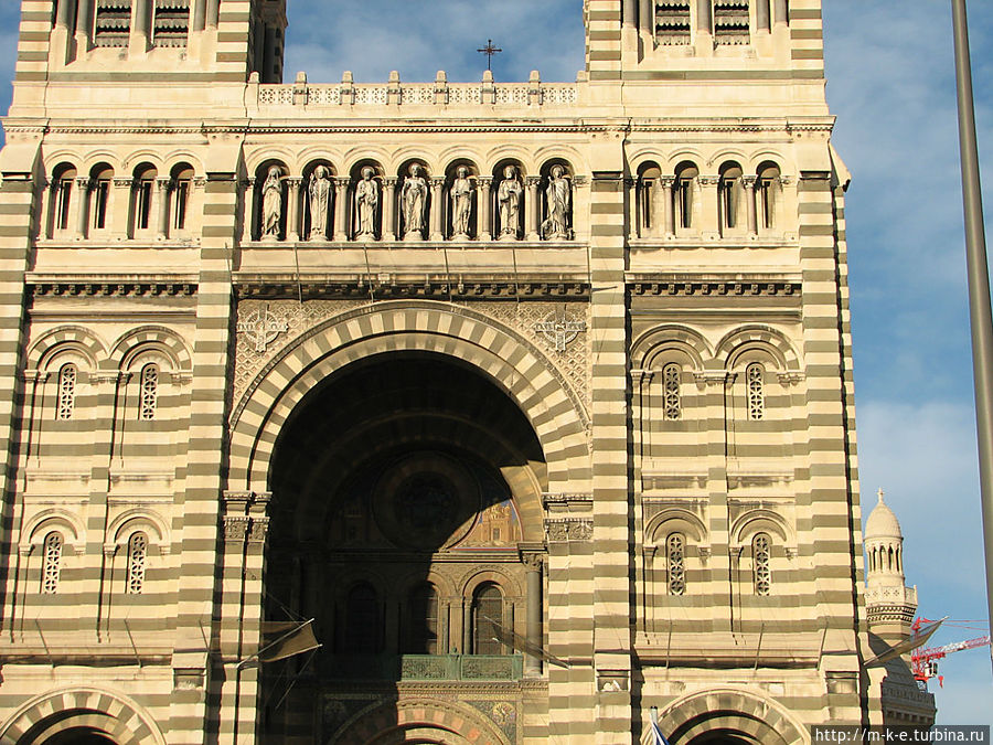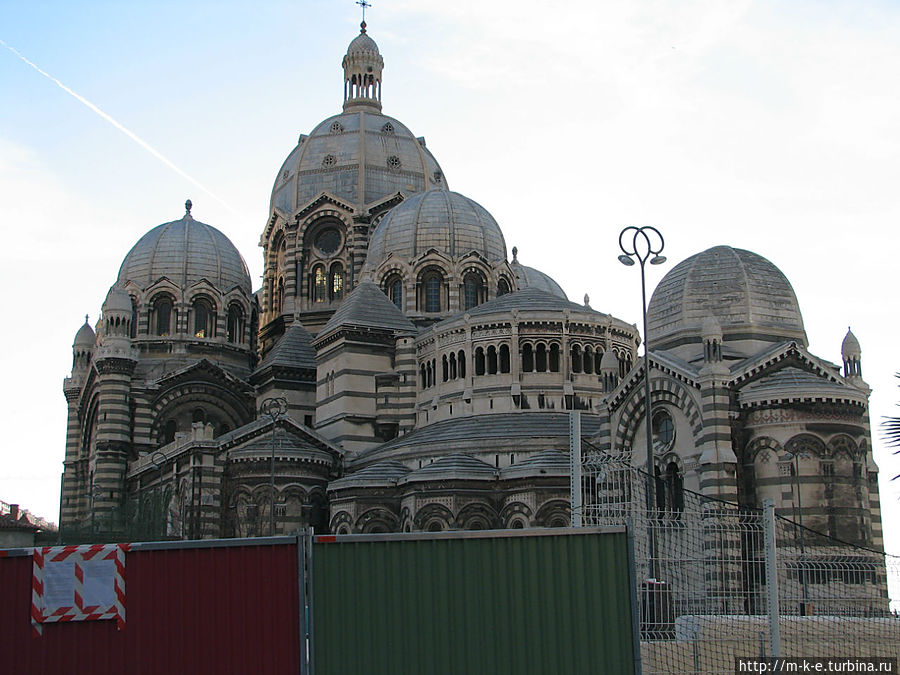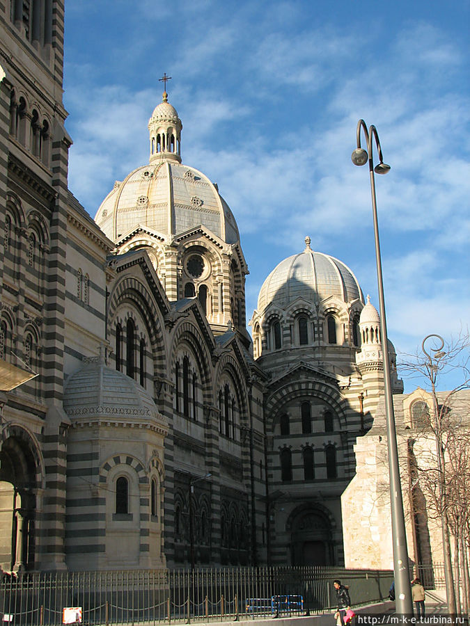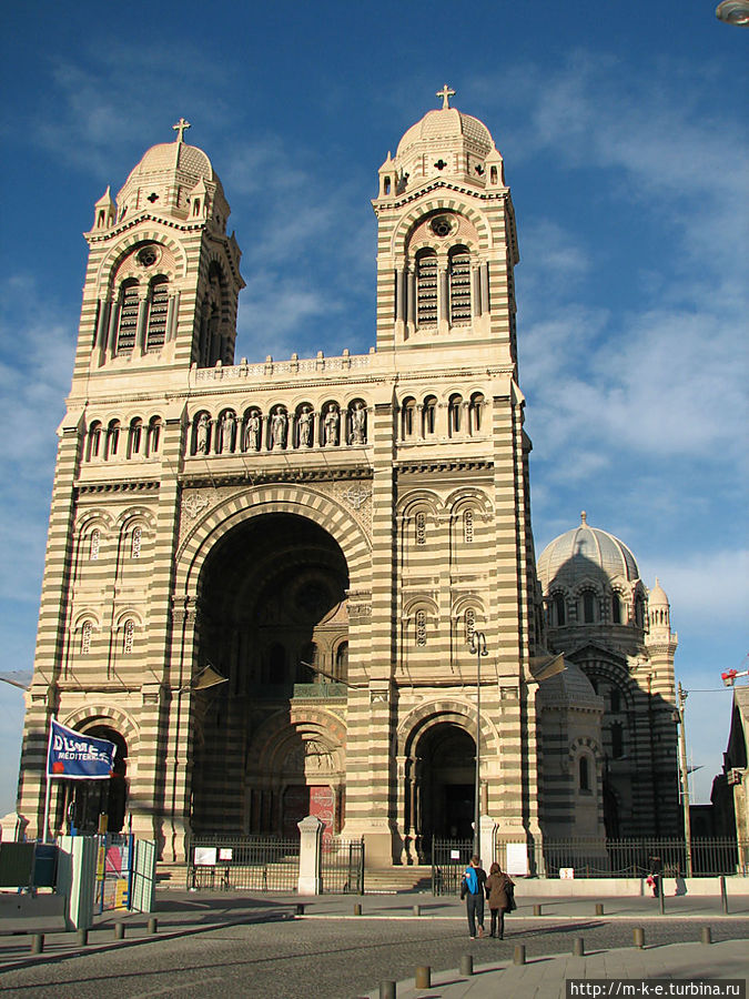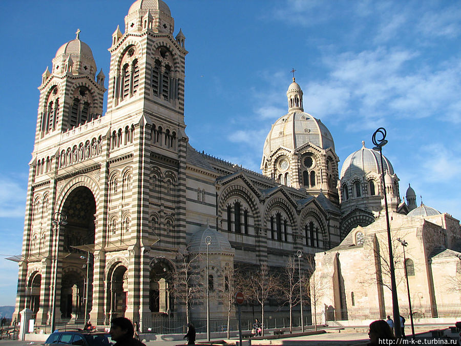Здание из белого и зеленого камня стоит рядом со Старым собором. Собором от которого веет древностью. Этот собор родом из 12 века, прозванный старым, носит имя la vieille Major. Здание из розового куроннского камня в плане имеет латинский крест и представляет собой прекрасный образец романской архитектуры Прованса. В 1852 году, чтобы освободить место под строительство нового собора, старое здание решили снести, однако жители Марселя и Французское общество по охране памятников воспротивились этому. В результате у «старого собора» убрали два пролета и колокольню, а бывший собор стал приходской церковью, которая функционировала до середины 20 века. Сейчас древнее сооружение закрыто на реставрацию.Вот так плавно перейдем в 1852 год, когда началось строительство Кафедрального собора. Первый камень в основание был заложен Наполеоном III. Строительство продолжалось 41 год. «Новый собор» стал самым большим французским собором, созданным со времён Средневековья, его здание может принять одновременно 3 000 человек. Архитектура собора (проект Леона Водуайе) сочетает в себе многие стили и направления: византийский стиль (купола, мозаики), романские и готические элементы.
