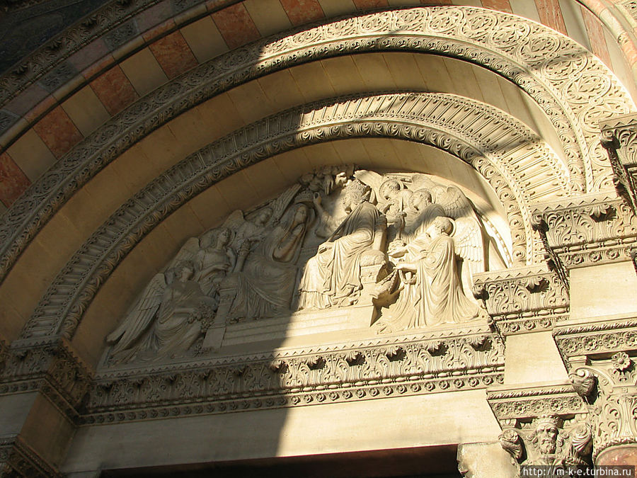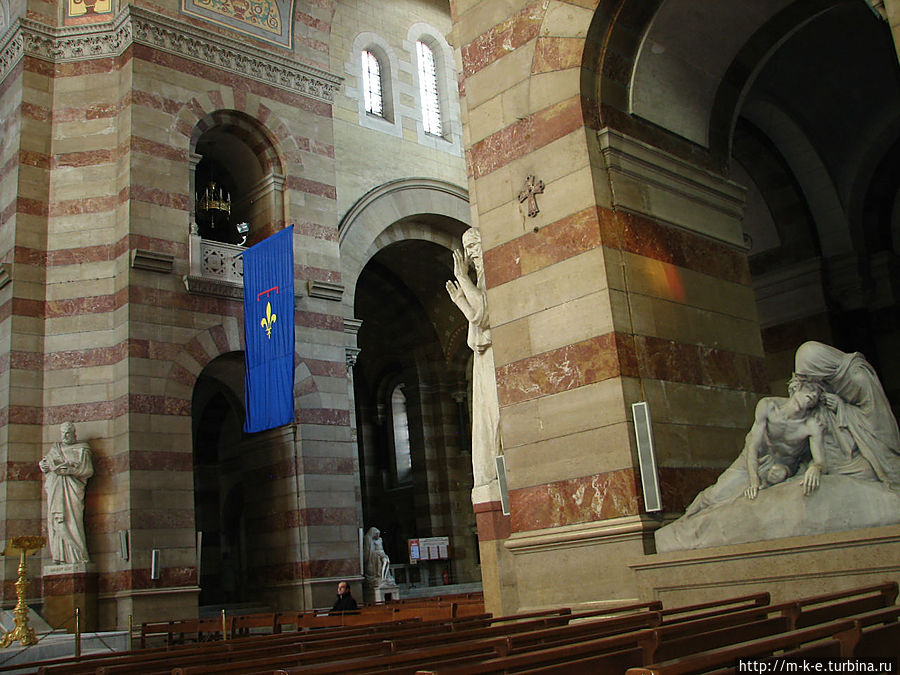 Входим в церковь и видим огромное помещение с тремя гигантскими пролётами. Своды арок и опоры выполнены из камня и мрамора, светлый охристый оттенок чередуется с красным. Над главным пролетом свисают флаги. Высокие окна украшены витражами. В третьем пролёте нефа расположена скульптурная группа работы Огюста Карли «Вероника, протирающая лицо упавшего Иисуса».
