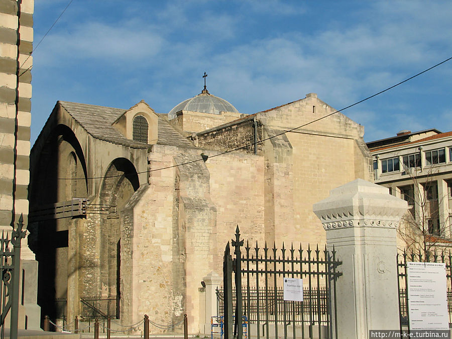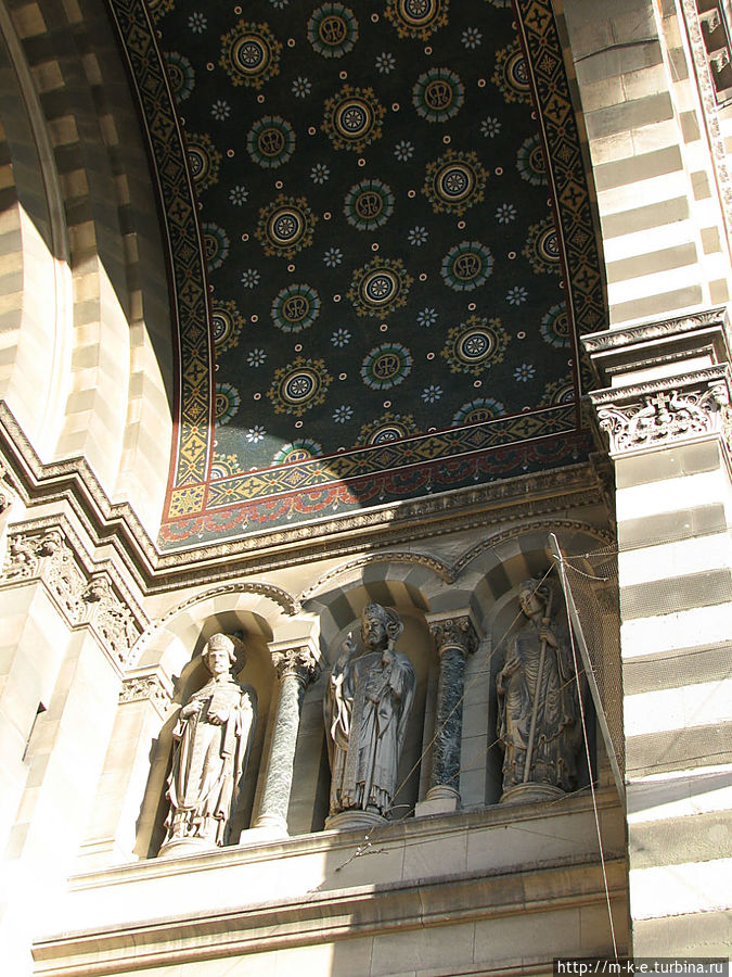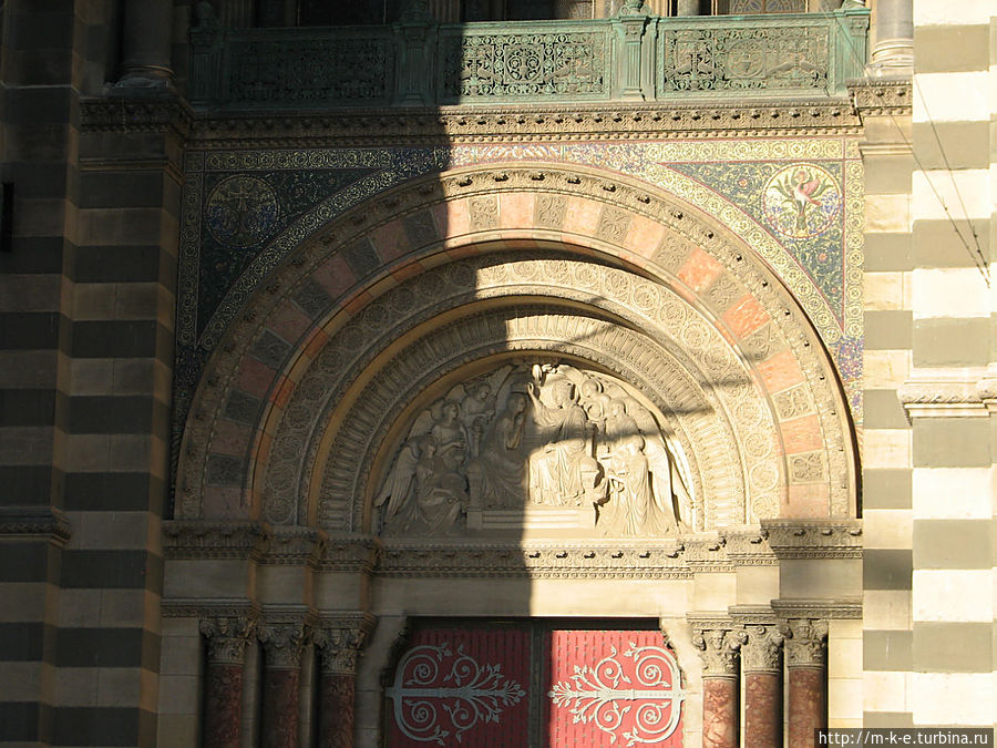 По обе стороны внешнего фасада возвышаются башни с куполами. Над портиком проходит галерея, связывающая башни; здесь расположены скульптуры, изображающие Христа (в центре), апостолов (Пётр и Павел) и святых, особо почитаемых в Провансе (Лазарь, Марта, Максимин, Мария Магдалина). Арка портала украшена сине-золотой мозаикой в стиле одного из мавзолеев Галлы Плацидии в Равенне. В верхней части портика над тройной аркой – небольшая роза, по обеим сторонам которой выполнены мозаичные символические изображения Иерусалима и Вифлеема. Над входными дверями установлены мраморные барельефы: в центре (главный вход) – коронование Богоматери, с восточной стороны – два грифона, охраняющие Древо жизни, а над западным входом – Агнец Апокалипсиса.