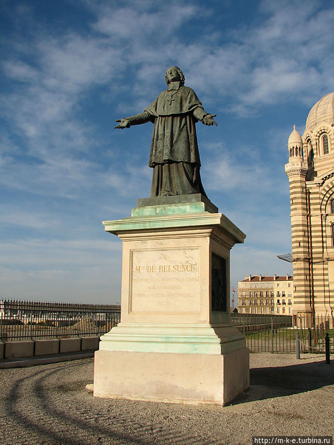 Здание собора состоит из монументального портала с двумя башнями и величественного нефа с капеллами. Перед тем как войти в собор обратим внимание на памятник Анри де Бельзюнса, епископа Марселя в период страшной эпидемии чумы в 1720.