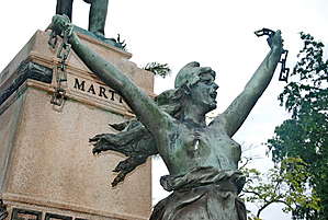 Кроме самого апостола революции, чтобы площадь действительно оправдывала свое название, к композиции добавлена статуя, изображающая Свободу. Женская фигура поразительно напоминающая персонажа картины Эжена Делакруа "Свобода, ведущая народ на баррикады". Ну правда вместо красного флага у нее в руках разорванные цепи, но спавшее с груди платье не оставляет поля для других ассоциаций.