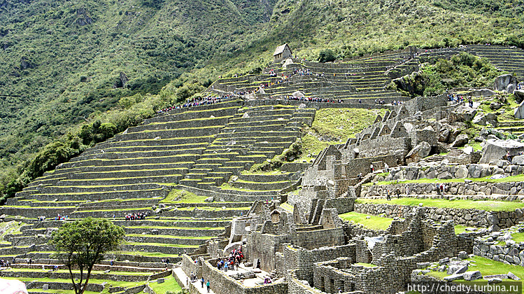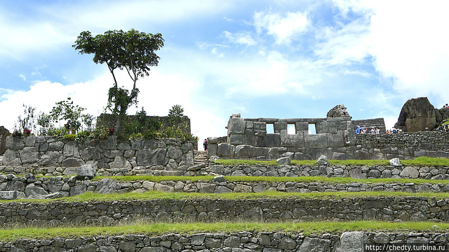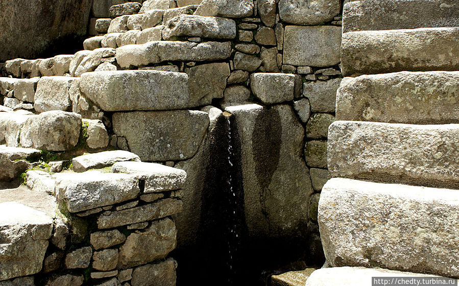Комплекс находится в седловине гор Мачу и Вайна Пикчу. Посередине комплекса огромная поляна размером с футбольное поле, по периметру идет повышение и расположенны здания, вода должна стекать в центр на поляну, т.е. там должен быть бассейн. Ничего подобного поляна сухая, проверил не сомневайтесь. По всей видимости седловина сформирована крупным не окатаным гравием который хорошо фильтрует воду. Кроме этого можно предположить, что такая высокопористая гравийная подушка хорошо гасит удар землетрясения, должна по идее.