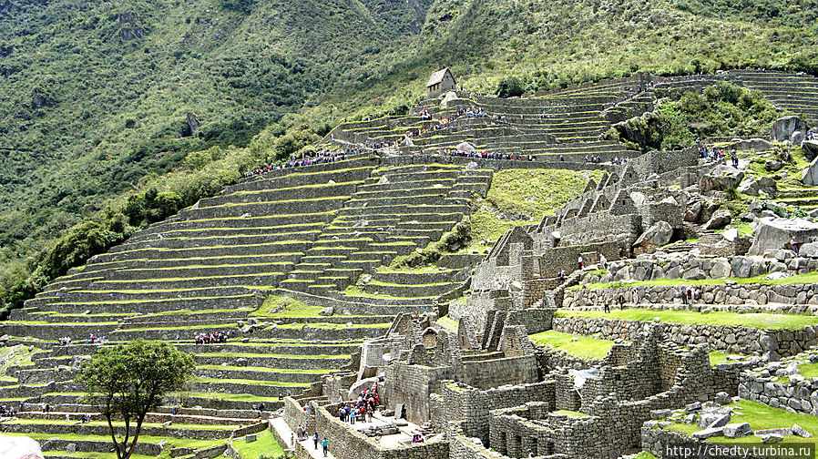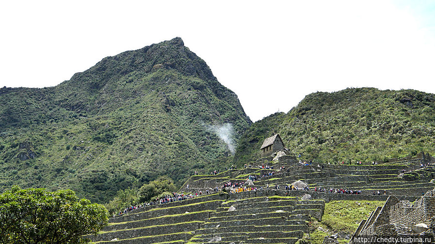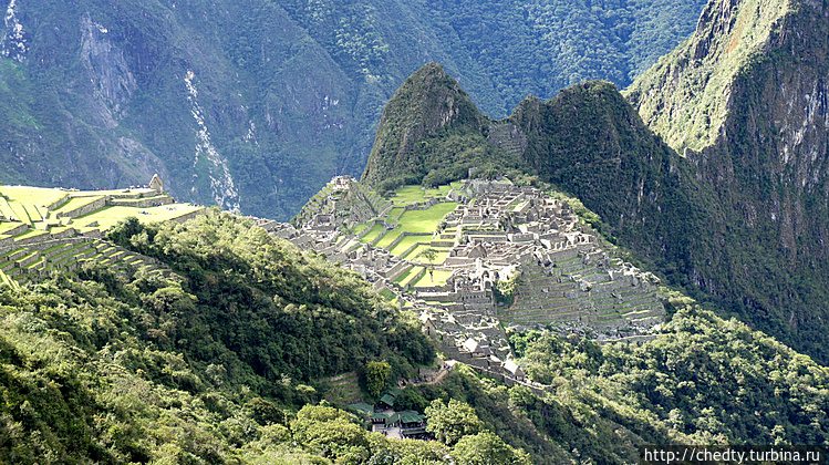 Хороший аккуратный вагон с кожаными креслами (за ваши деньги, вагон ресторан в стиле Восточного Экспресса), мерседесовский автобус на гору. Все это вместе занимает часа два-три, но поездка совершенно не скучная, кругом величественные горы рядом бурная река. Поезд подходит к городку, который называется, кажется, Агуас Салиентес, впрочем все называют его Мачу Пикчу, чтобы не напрягаться. Там мы остановились в гостинице Sumaq, еще одно достойное заведение. Собственно в гостиницу мы даже заходить не стали просто отправили туда вещи, а сами сели в автобус, который повез нас на Мачу Пикчу.