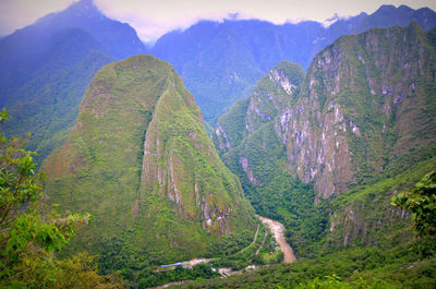 Автобус буквально ползет по серпентину в гору, а мы не отрываясь от окна, восхищаемся потрясающими пейзажами. Выходим, приехали! Вот там, далеко внизу, слева видна синяя линия — это наш поезд. А перед нами — горы Священной долины.