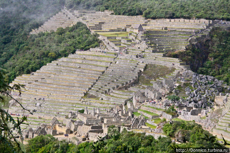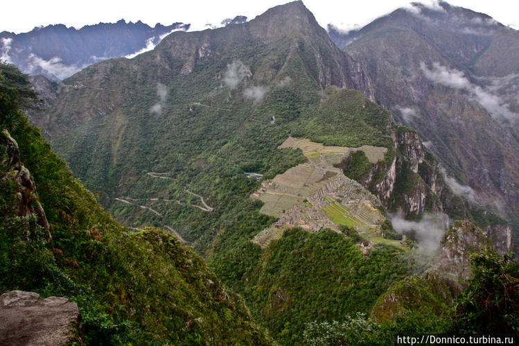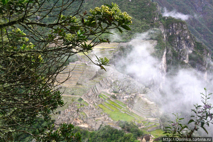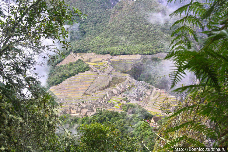 Вскоре через плотную листву джунглей каким-то расплывчатым туманным пятном выделился внизу Мачу Пикчу. Так и хочется сказать, выделился, отпочковался от горы и полетел. С учетом узкого подъема по крутой тропе, формируется полнейшая иллюзия полета: ты летишь, и Мачу Пикчу тоже летит куда-то вдаль.