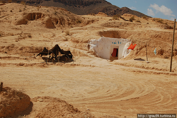 А о появлении этих подземных жилищ есть страшное предание. Давно это было когда на землях Туниса господствовали римские завоеватели. Уже были разгромлены Карфаген и Египет. Римляне отдали земли, населённые берберами, двух египетским племенам и разрешили им строить на этих землях дома в любом месте. Правило :" Есть человек — есть проблема. Нет человека- нет проблемы" действовало и в ту далёкую пору. Римляне разрешили убивать всех, кто попадётся на пути, безразлично воин это или безоружный старик или ребёнок. Надо было берберам спасаться. Но где прятаться в пустыне, здесь не было шумевшего сурово брянского леса , помогавшим советским партизанам времён Великой Отечественной Войны. И в умную берберскую голову пришла замечательная мысль — зарыться в землю, а по ночам выползать из-под земли и громить иностранных захватчиков и оккупантов. Сказано — сделано. Как любят говорить в таких случаях — земля горела под ногами оккупантов. А берберских партизан найти было невозможно — они сидели со своими семьями под землёй. Не случайно в самые глубокие пещеры — жилища можно и сейчас забраться только с помощью верёвочной лестницы. А тогда верёвка была просто необходима и чем глубже была пещера, тем больше шансов было на спасение.