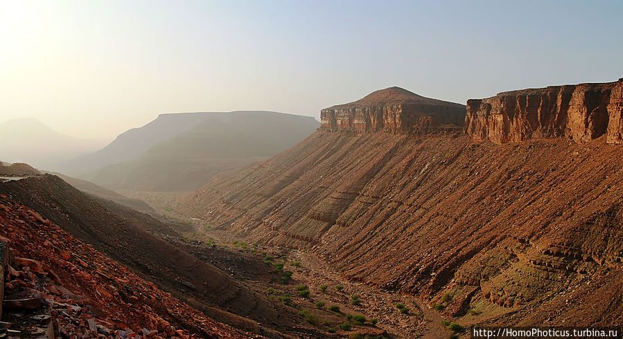 Неожиданно оказалось, что въехали в долину, по которой протекало несколько ручьев и обрамленную высокими обветрившимися столовыми горами, и кое-где наметилось подобие серпантина. И тут мы приехали в городишко Атар, где с удовольствием пообедали жареной курицей с картошкой, а также соками — вкусными но, к сожалению, не местными; и отбились от настойчивого маркетинга местных жителей, по виду похожих на сильно загоревших арабов.
