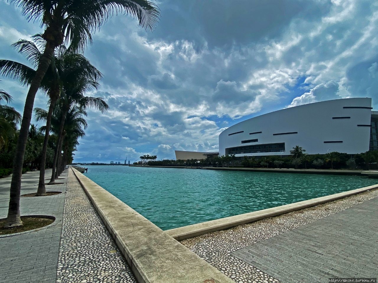 Музейный парк и здание стадиона FTX Arena разделяет очень прямоугольно-правильной формы залив...