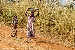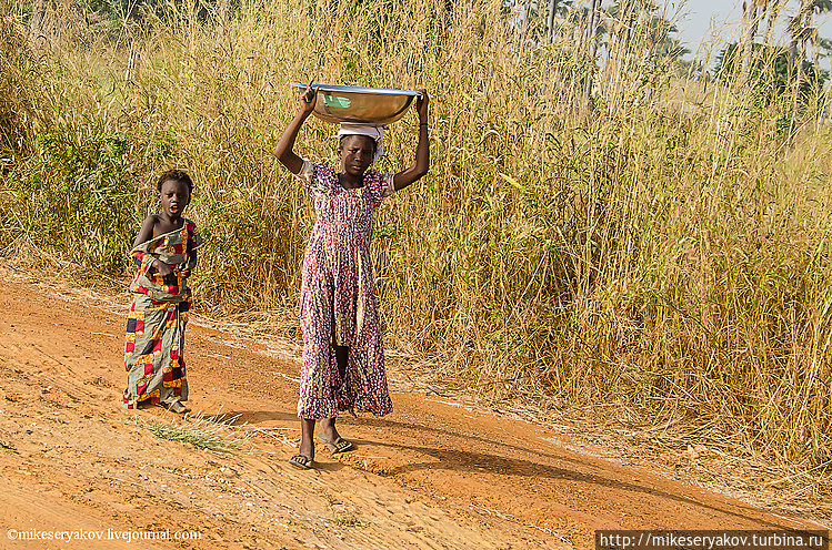 Даже маленькие девочки уже приспасабливаются к переносу вещей на голове.