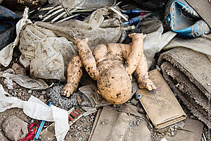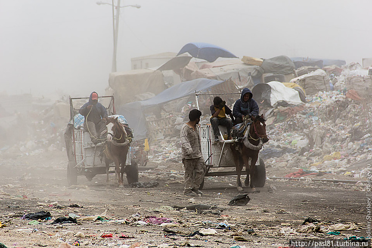 Наконец, после вышек тюремной цитадели, показались горы мусора. Одинокая фигура проводила нас взглядом с вершины холма. Впереди — высокая эстакада окружной дороги, где не замечая что творится внизу, несутся машины. А впереди открывается зрелище из постапокалиптических фильмов! В пыльной дымке проносится лошадиная повозка с кучером, закутанным в какие-то лохмотья. Ветер гонит через "дорогу" обрывки пакетов и какие-то тряпки. Урчат моторами огромные мусорные грузовики, еле видные за огромными горами отходов. Сквозь тяжелый, дымный воздух глаза неожиданно обнаруживают какие-то хижины, среди которых бродят закутанные в многие слои рванья, фигуры…