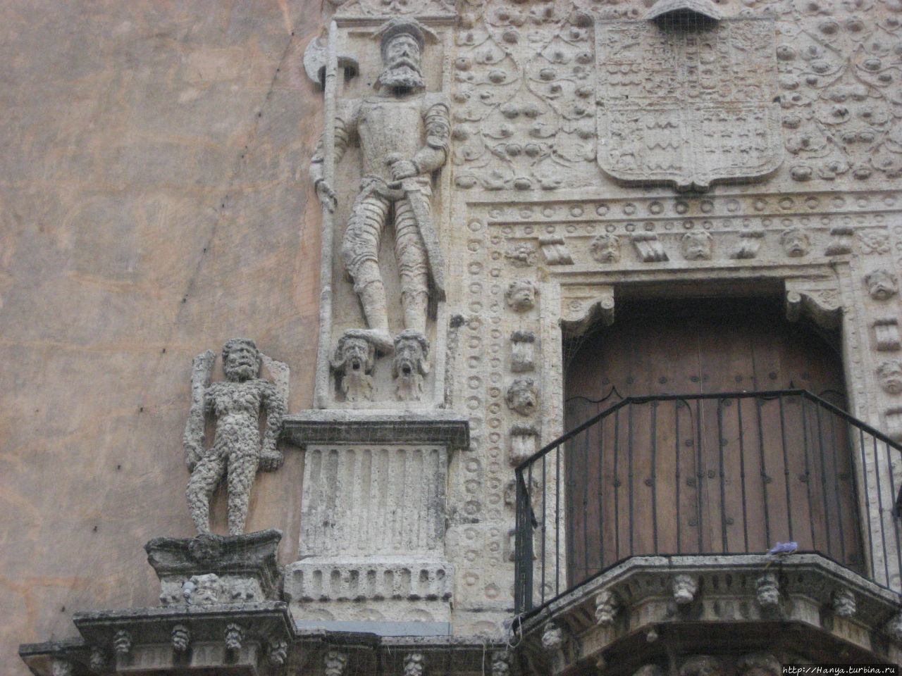 Поскольку не сохранилось портретов этих персонажей, трудно сказать соответствуют ли их скульптурные изображения действительности, да и они ли это. Однако известно, что портреты архитекторов или скульпторов на их работах является традицией эпохи Возрождения, и таким образом было бы ничего странного, если бы и архитектор, и его основатели, сделали украшение дома в виде своих собственных изображений. Приглядитесь к изображениям под балконом: богато украшенный бородатый воин с каким-то тюрбаном или шлемом – это Монтехо, один из самых безжалостных завоевателей; справа-женщина с украшениями в прическе – его жена, а посередине-маленький бородатый мужчина, держащий балконную планку в форме капителя – это архитектор.