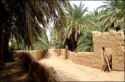 На фоне плантации из тысяч финиковых пальм мы увидели большую деревню.