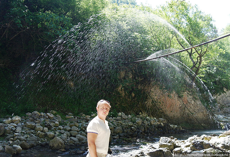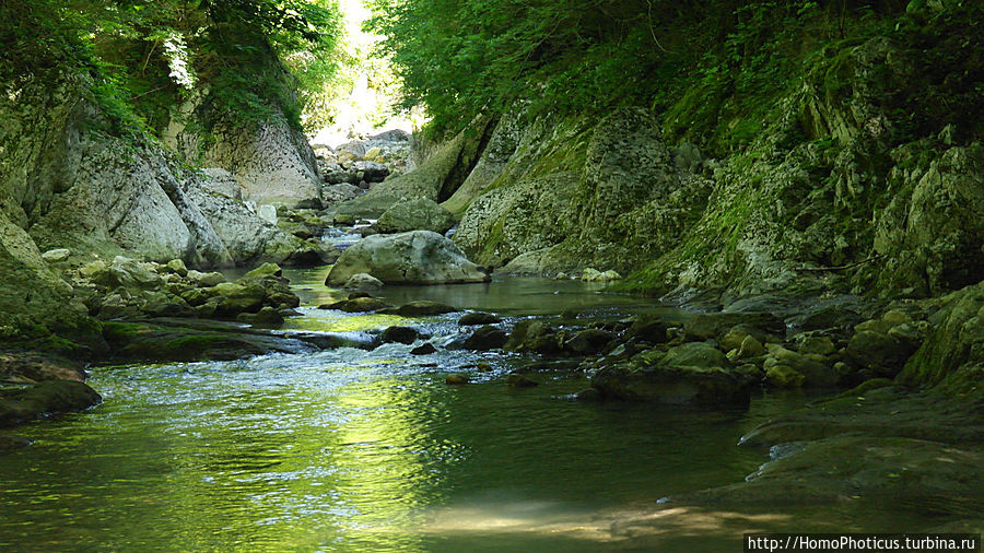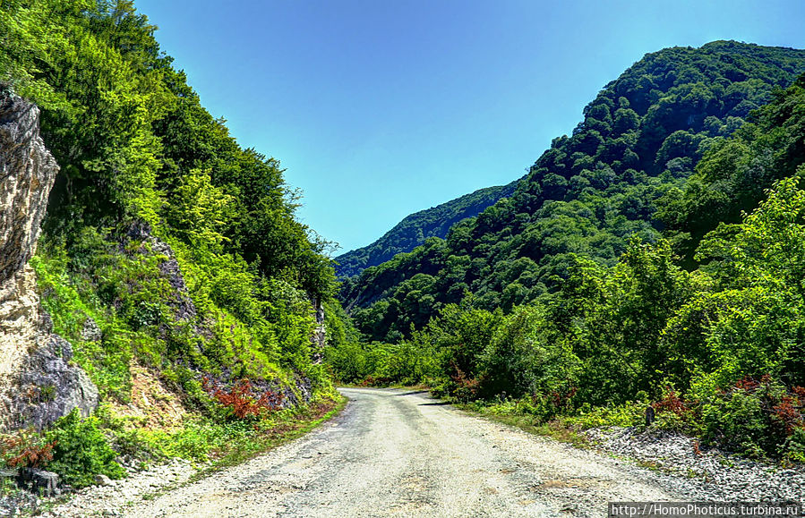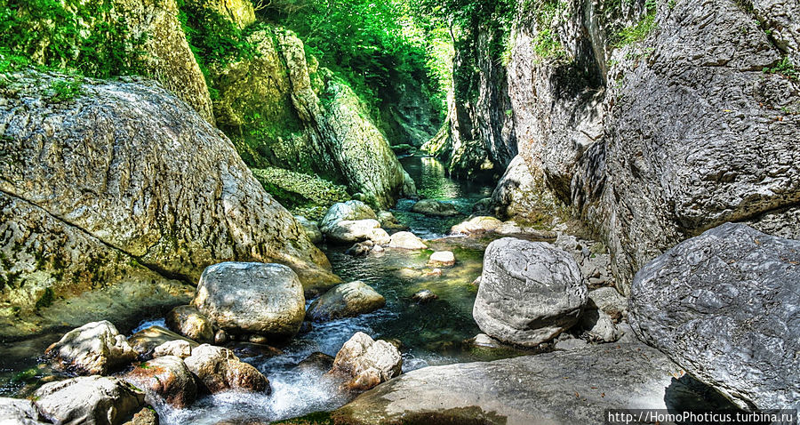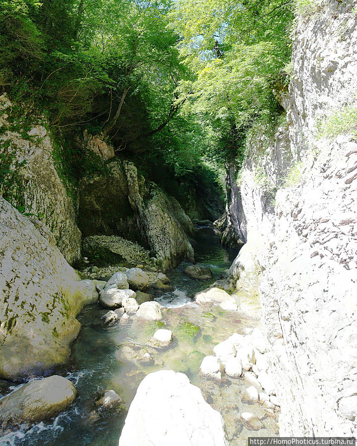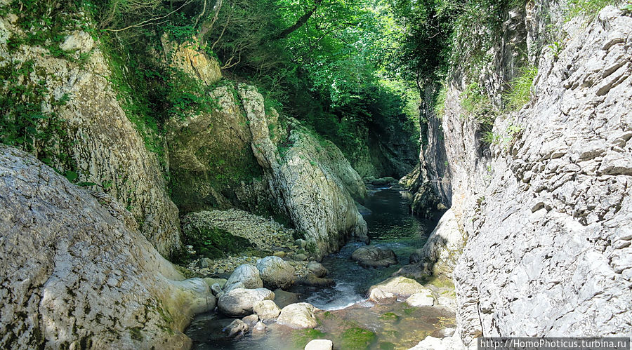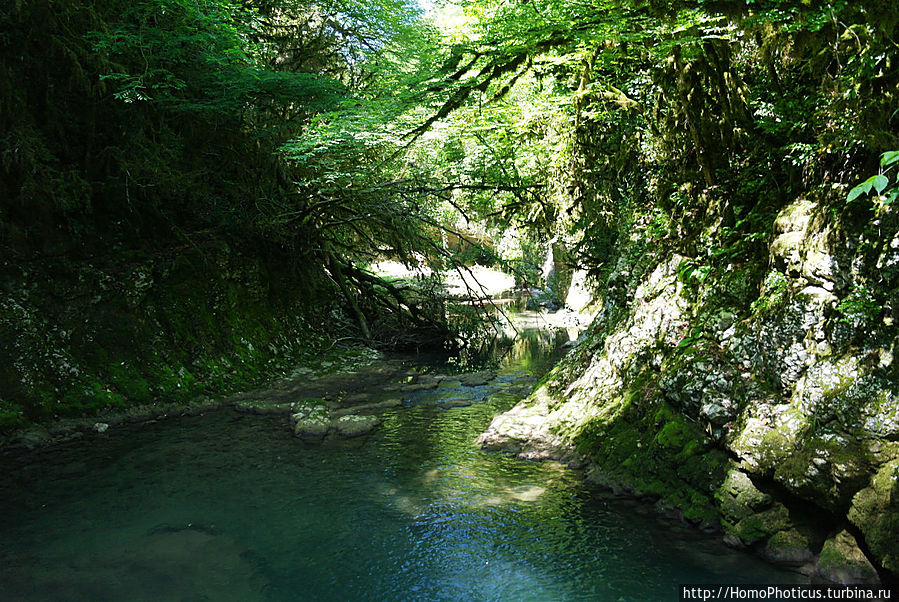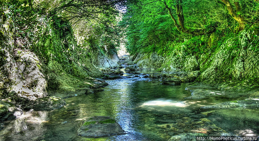 Ущелье в Абхазии возникает неожиданно: вот ты едешь по дороге, вот ты отъехал от селения, и вдруг водила останавливает транспорт — все, приехали. Недоуменно переглядываясь, выходишь на дорогу и видишь справа от дороги тропку куда-то вниз. Делаешь два шага — и ты уже в "Аватаре": окружают покрытые мхом деревья, листва закрывает небо и свет доходит спустя чреду преломлений и отражений, под ногами — ковер из мха и мелких веточек, а иногда и хвои, а еще ниже видишь быстро текущий поток. И поток этот течет в полированном русле, искрясь, переливаясь серебром, зеленью, окружаясь радужным ореолом и утекает — причем течет в каменном тоннеле, а сверху он закрыт насыщенным зеленым сводом деревьев, смыкающихся в верхней точке. С боков стекают еще ручьи, водопадики, а еще добавляет колорита ржавая водяная труба, сквозь которую фонтанируют струи воды, красивыми параболами обрамляя пространство.