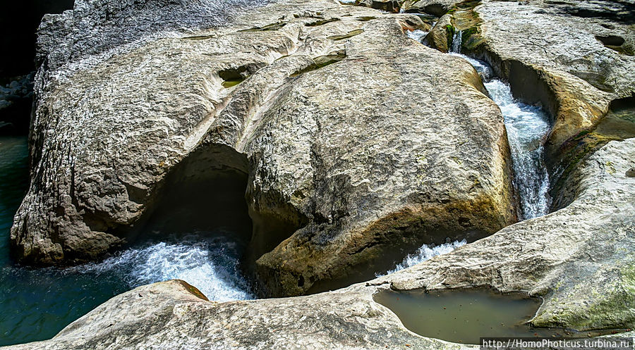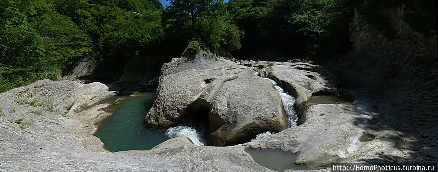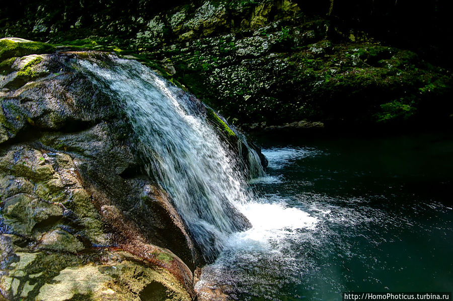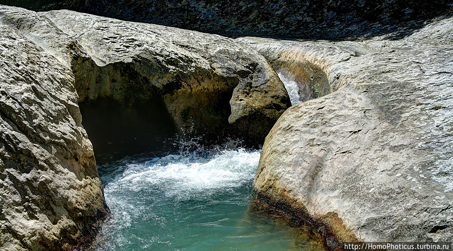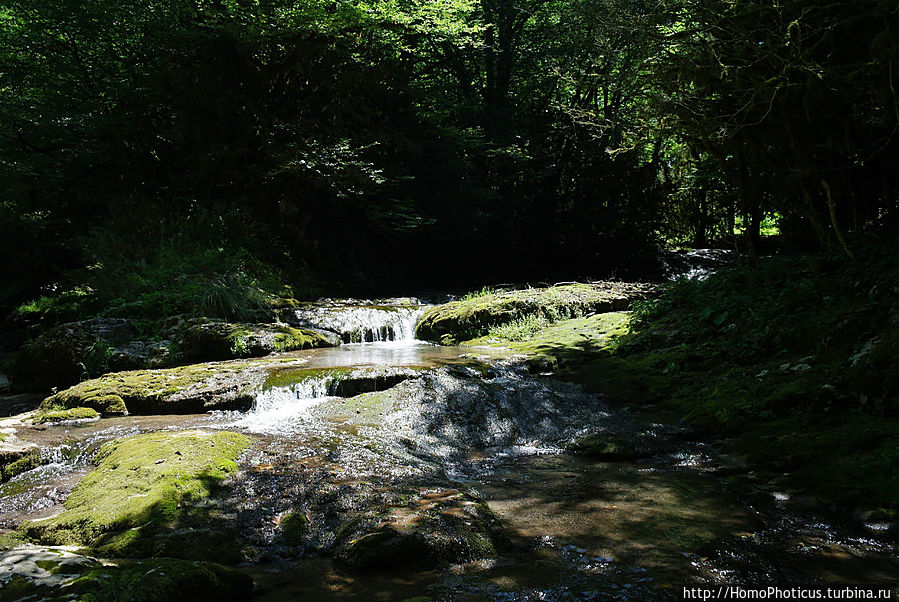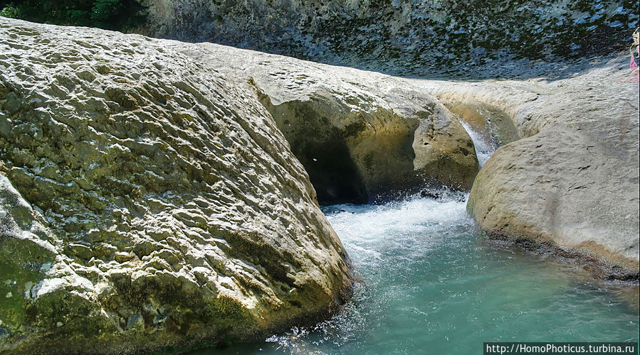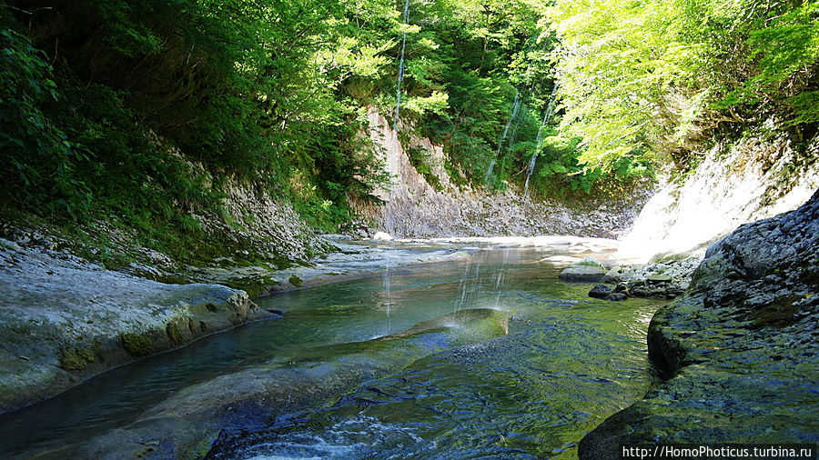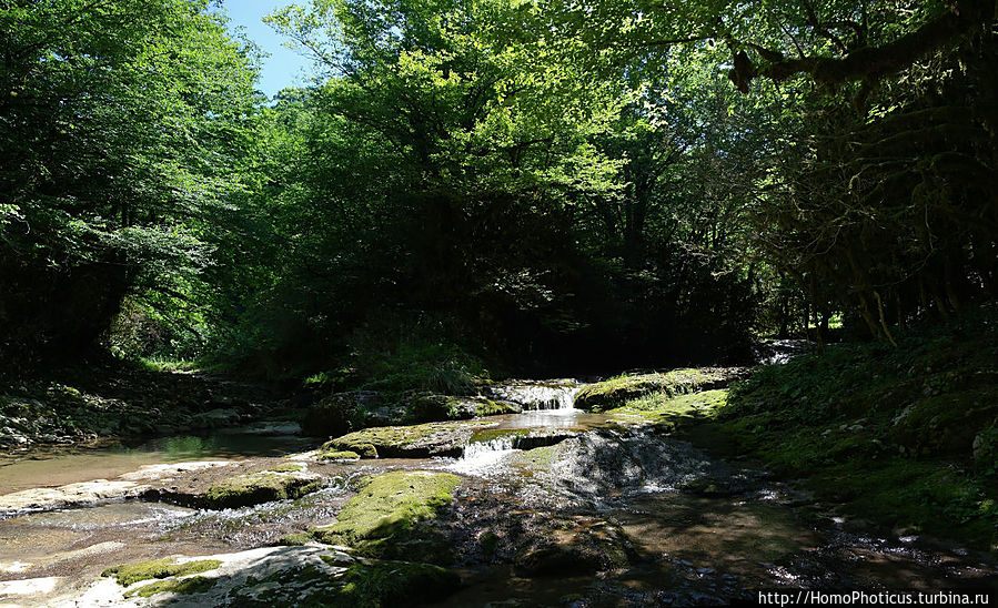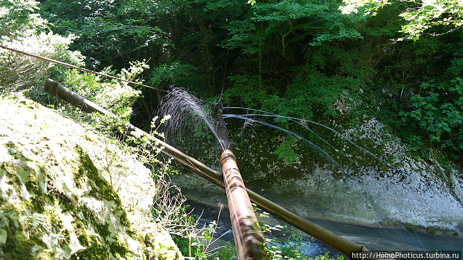 Ущелье в Абхазии возникает неожиданно: вот ты едешь по дороге, вот ты отъехал от селения, и вдруг водила останавливает транспорт — все, приехали. Недоуменно переглядываясь, выходишь на дорогу и видишь справа от дороги тропку куда-то вниз. Делаешь два шага — и ты уже в "Аватаре": окружают покрытые мхом деревья, листва закрывает небо и свет доходит спустя чреду преломлений и отражений, под ногами — ковер из мха и мелких веточек, а иногда и хвои, а еще ниже видишь быстро текущий поток. И поток этот течет в полированном русле, искрясь, переливаясь серебром, зеленью, окружаясь радужным ореолом и утекает — причем течет в каменном тоннеле, а сверху он закрыт насыщенным зеленым сводом деревьев, смыкающихся в верхней точке. С боков стекают еще ручьи, водопадики, а еще добавляет колорита ржавая водяная труба, сквозь которую фонтанируют струи воды, красивыми параболами обрамляя пространство.