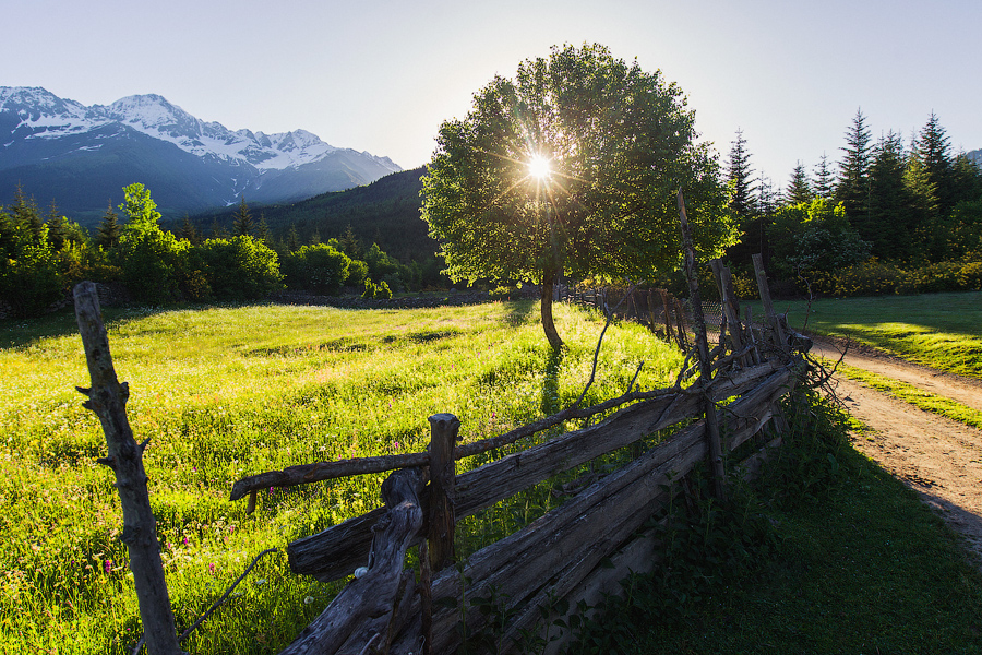 В общем в Местию доехали только в полночь.. Сначала водитель хотел, чтоб мы остались у его знакомых.. Но мы объяснили, что хотим спать в палатках, и он повез нас за город.. Приехали в какое-то место.. вышли осмотреться — вокруг куча мусора, ничего хорошего.. И говорим водителю — не нравится, свалка какая-то.. Тот отвечает — не вопрос, поехали в следующее место! Сложно представить, чтоб у нас водитель маршрутки ночью возил туристов непонятно где за городом, пока те не выберут подходящее место для ночевки.. В этот раз заехали куда-то совсем далеко, нашли подходящую полянку, поблагодарили водителя, поставили палатки и легли спать... Чтобы проснуться утром и восхититься красотой места, в котором ночевали...!