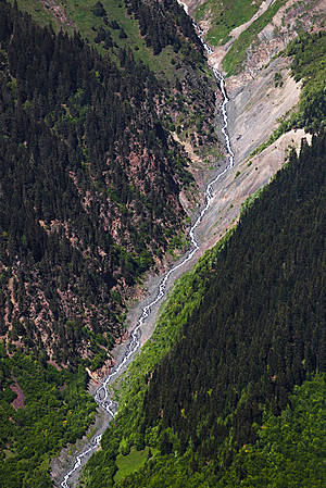 Пока мы ужинали, водитель с напарником успели на двоих выпить три литра пива:) Как мы поняли дальше, тут это в порядке вещей.. или просто, чтоб не страшно было ехать по этой дороге! Путь в Местию — это больше 100 км горного серпантина.. Всю дорогу смотришь в окно с открытым ртом... То ущелье, дна которого даже не видно, то горная река, то красивейшее озеро, то старинные тоннели, с потолка и по стенам которых бегут ручейки.. Некоторые участки дороги только расчищены после очередного обвала.. И все это на огромной скорости!