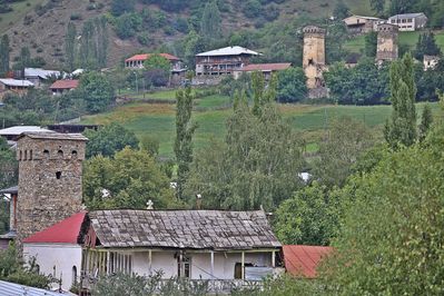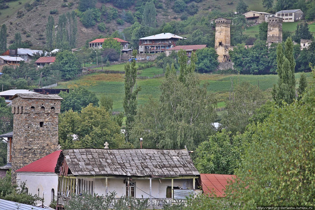 Некоторые скопления башен условно есть как бы в трех местах, но полно и башен единоличников. С начала 20-го века по всей Сванетии прокатилась волна разрушения башен. Были снесены сотни. Даже сложно представить как выглядели эти поселения в те годы. Сносили то самые знаковые строения, самые вызывающие. Например князья Дадешкелиани перед приходом большевиков сами взорвали свою башню, которая была 35 метров в высоту. Но и сейчас в Местии больше башен чем в знаменитом на весь мир Сан-Джемильяно, который называют *Городом ста башен* хотя их там всего 14-ть. В Местии больше 20-ти, а с соседними сёлами легко полсотни наберётся.В некоторые башни есть возможно взобраться на крышу, правда это довольно рискованный процесс. Лестницы связанны кое как из гнущихся и трещащих веток. Узкие, пыльные щели в этажных перекрытиях и полуразрушенная крыша из старых досок. И самое обидное что вид с крыши башни ничего не добавляет к обзору, это не самая высокая точка, это просто одна из высот рельефа Местии, и пройдя полчаса по любой из дорожек в сторону вы подниметесь на такой же уровень, но по дорожке.