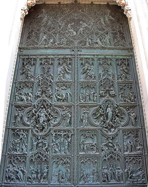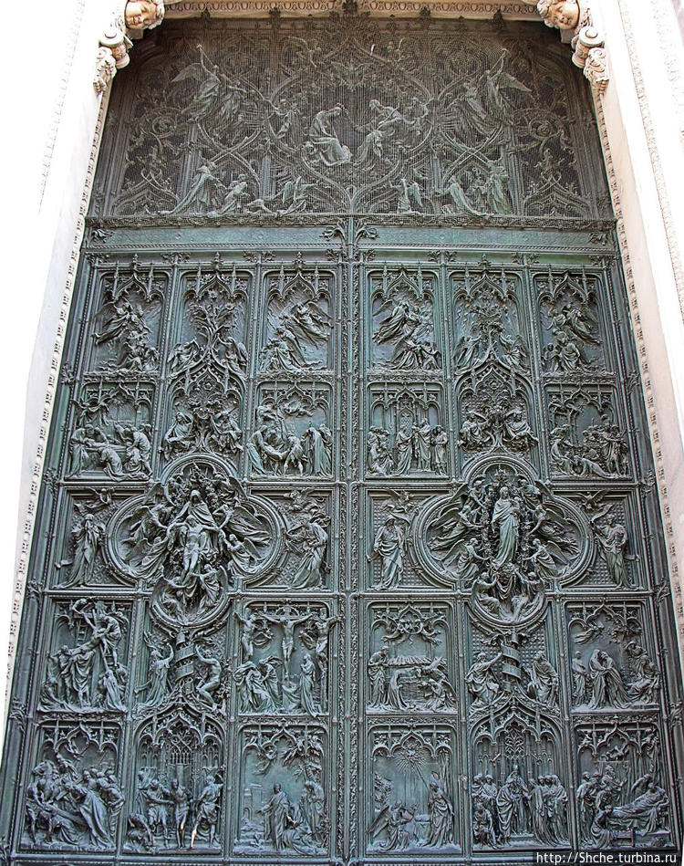 Но над внешним видом собора поработали не только резчики по мрамору. Здесь еще уникальные двери с глубоким бронзовым литьем.