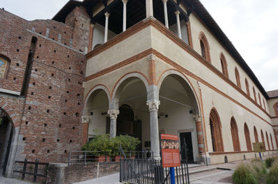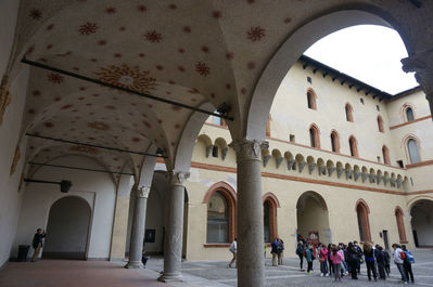 Музеев на замковой территории несколько, они разделены по темам. Во дворе есть схема с пояснениями. Древнейшие находки, найденные на территории Милана, вместе с египетским отделом в подземных помещениях экспозиции. А в зале Античного искусства ломбардские доспехи XVI века в коллекции старинного оружия, всадники на бутафорских конях. Там есть творение Микеланджело «Пьета Ронданини» (1564), последняя работа гения, оставшаяся незавершенной. В одном из залов вышитые люнеты с серией портретов династии Сфорца. Фрески Леонардо, писанные по заказу, в зале делла Асте. 12 бесценных гобеленов с изображениями месяцев года со знаками зодиака в зале дела Балла. В Пинакотеке полотна Тициана, Липпи, Корреджо, Беллини, Мантеньи. Старинная мебель, коллекции керамики, музыкальных инструментов, ювелирных украшений. Это настоящая сокровищница, здесь так много всего, что обойти не просто, не то чтобы описать. Но все же общее впечатление я получила и несколько раз щелкнуть (пусть и в переходах) успела.