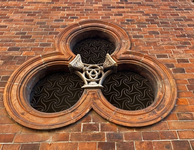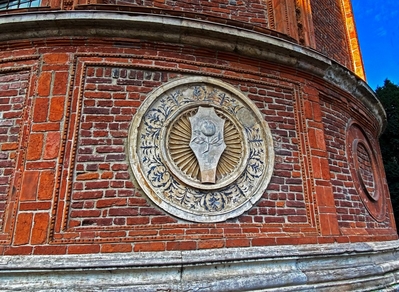 Обратили на себя внимание многочисленные гербы и профили на внешних стенах церкви.