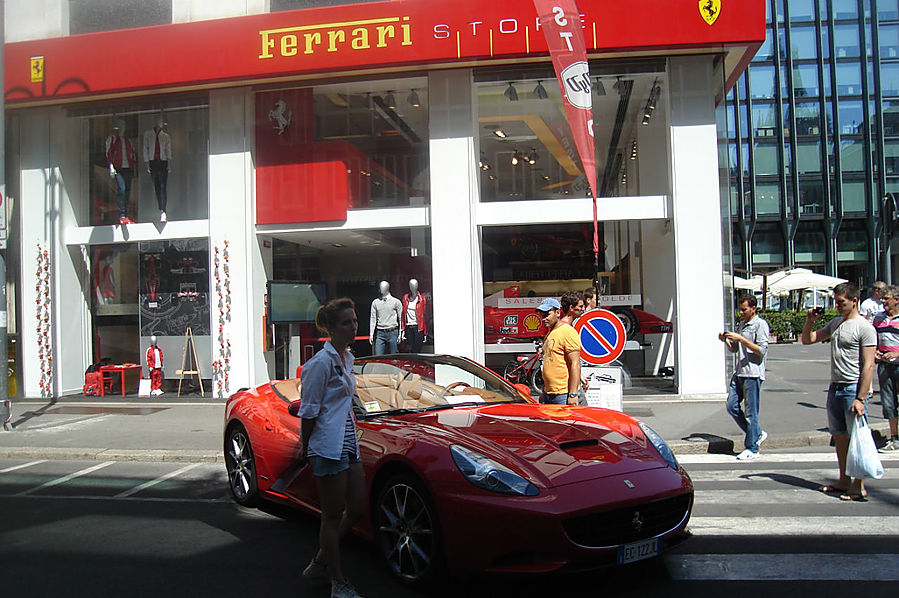 Найдя то, что искал, решил удалиться из этого перекрестка тщеславия, но тут же попался в капкан более заманчивый. Магазин Ferrari. Вернее внимание привлек не сам магазин, а стоящие около него Ламборджини и Феррари, на которых написано "Dont touch me! Rent me!"