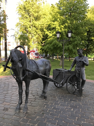 • И такая скульптурная композиция есть на площадке перед заводом, как напоминание о том насколько упростилась фермерская жизнь с обретением ими железных коней