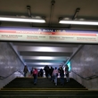 Сзади видны строительные ограждения для соединения станции с третьей линией метро. Начало 2020 года.